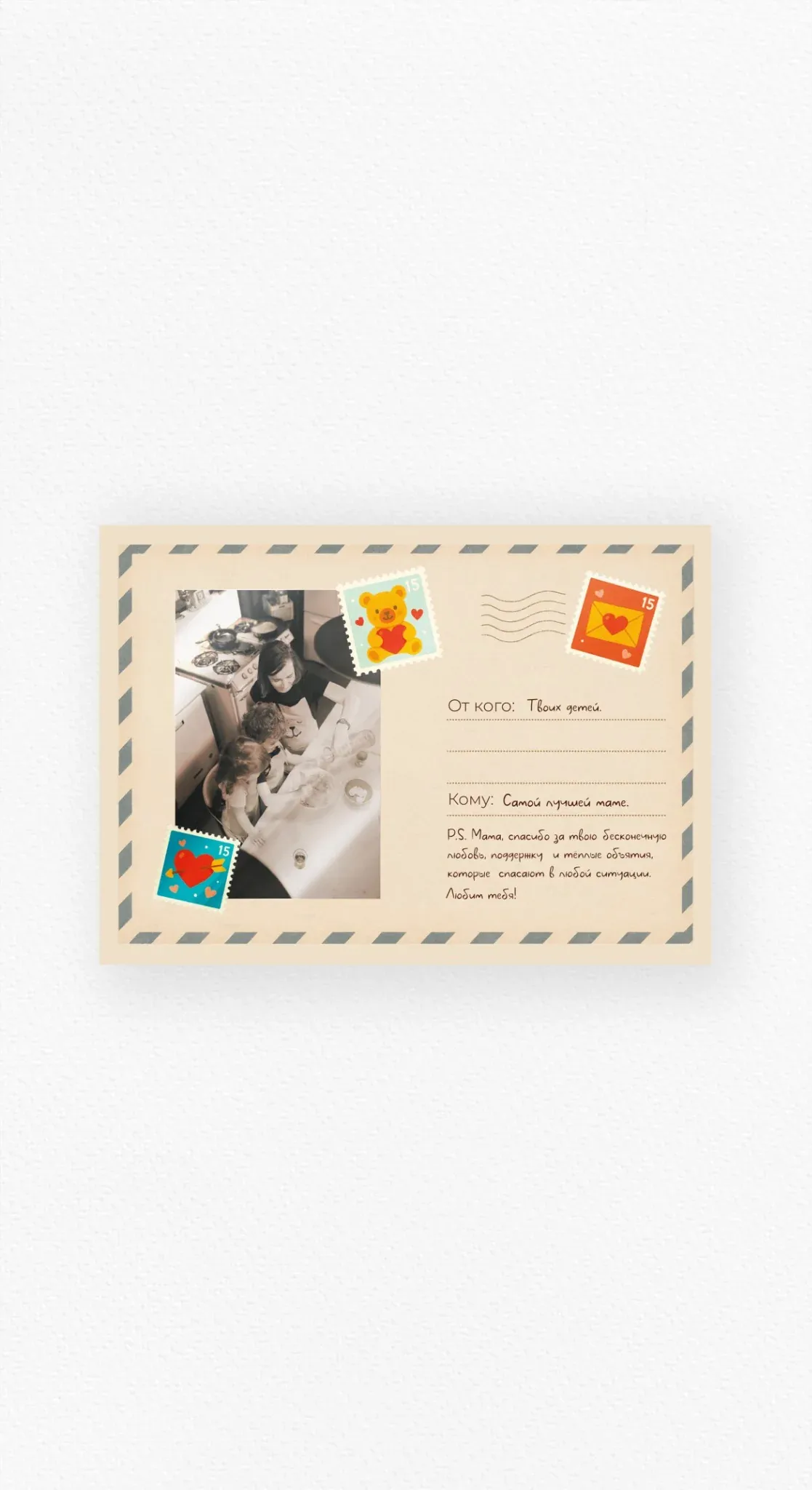 Дизайн выполнен в стиле почтового письма с тёплой, домашней атмосферой и милыми декоративными элементами. Текст выражает благодарность за заботу, поддержку и бесконечную любовь, делая открытку особенно душевной. Подойдёт для поздравления с Днём матери, днём рождения или как искренний знак внимания без повода