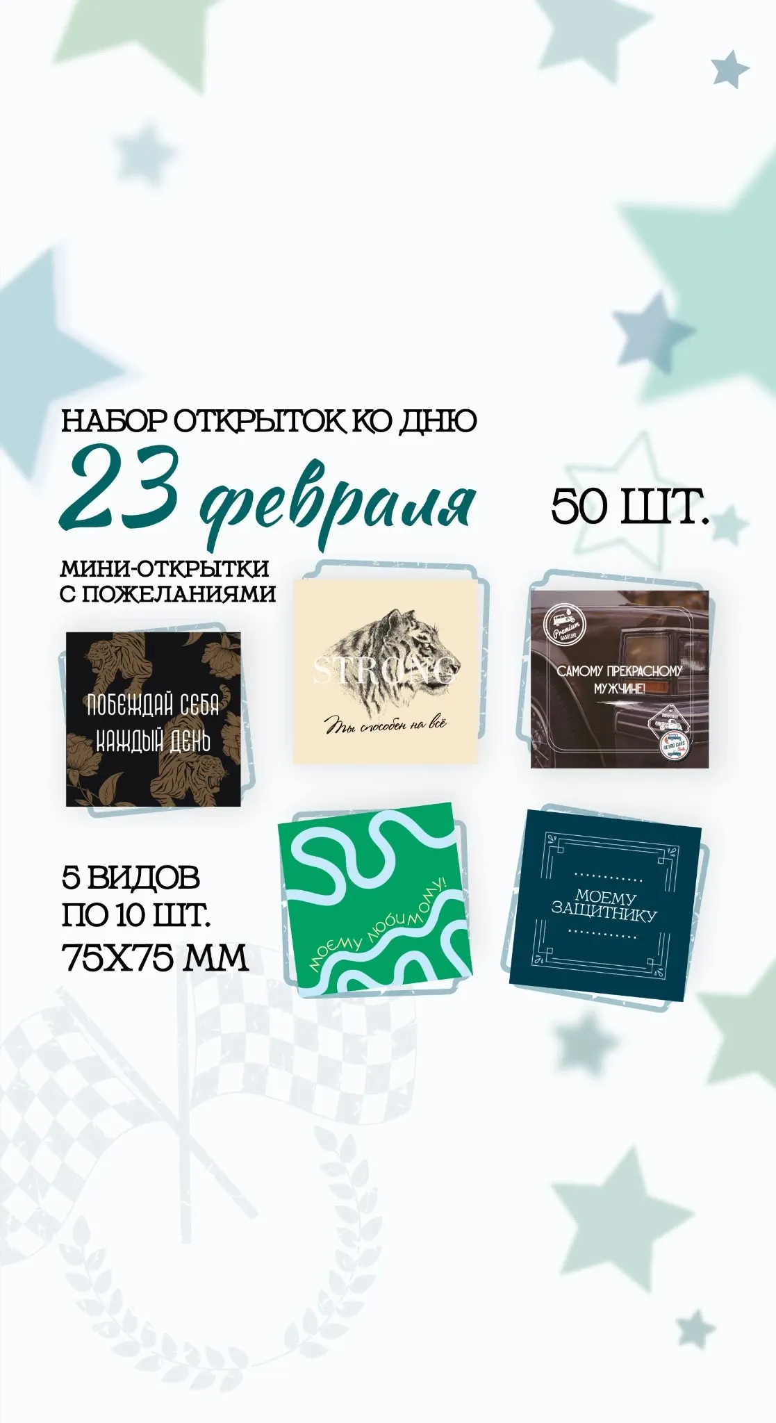 Подарочный набор мини-карточек ко Дню защитника Отечества с акцентом на силу, уверенность и внутренний стержень.